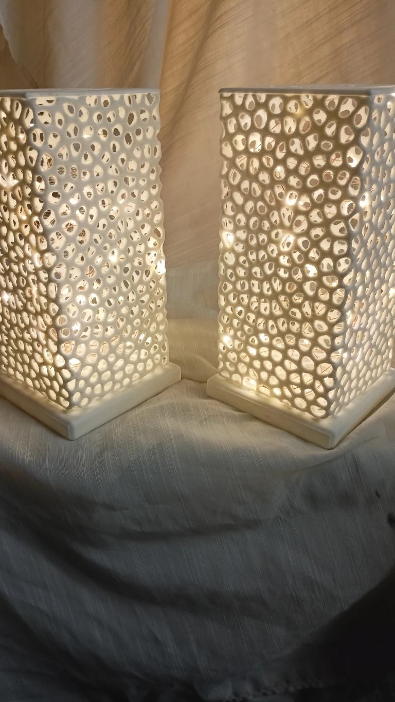 Bellissima lampada a forma di PARALLELEPIPEDO avente il lato di 10 cm mentre l'altezza e di 25 cm,realizzata attraverso stampa 3d con materiale vegetale e dipinta a mano.